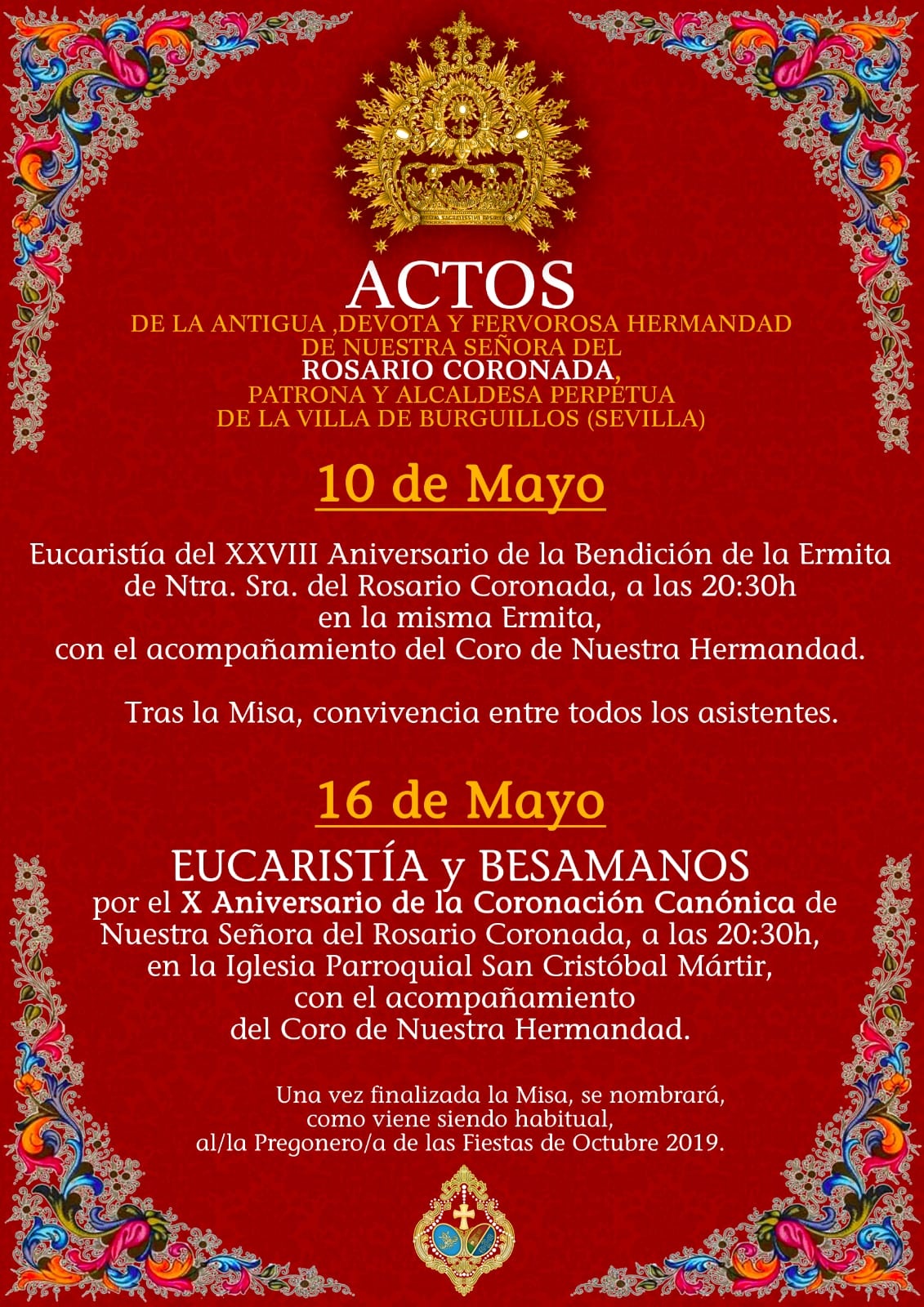 La Hermandad de Nuestra Señora del Rosario Coronada informa que el próximo viernes, 10 de Mayo, a partir de las ocho y media de la tarde, tendrá lugar, en la Madroña, la Eucaristía por el XXVIII Aniversario de la Bendición de la Ermita de la Santísima Virgen del Rosario Coronada. Tras la Misa, habrá una convivencia entre todos los asistentes.