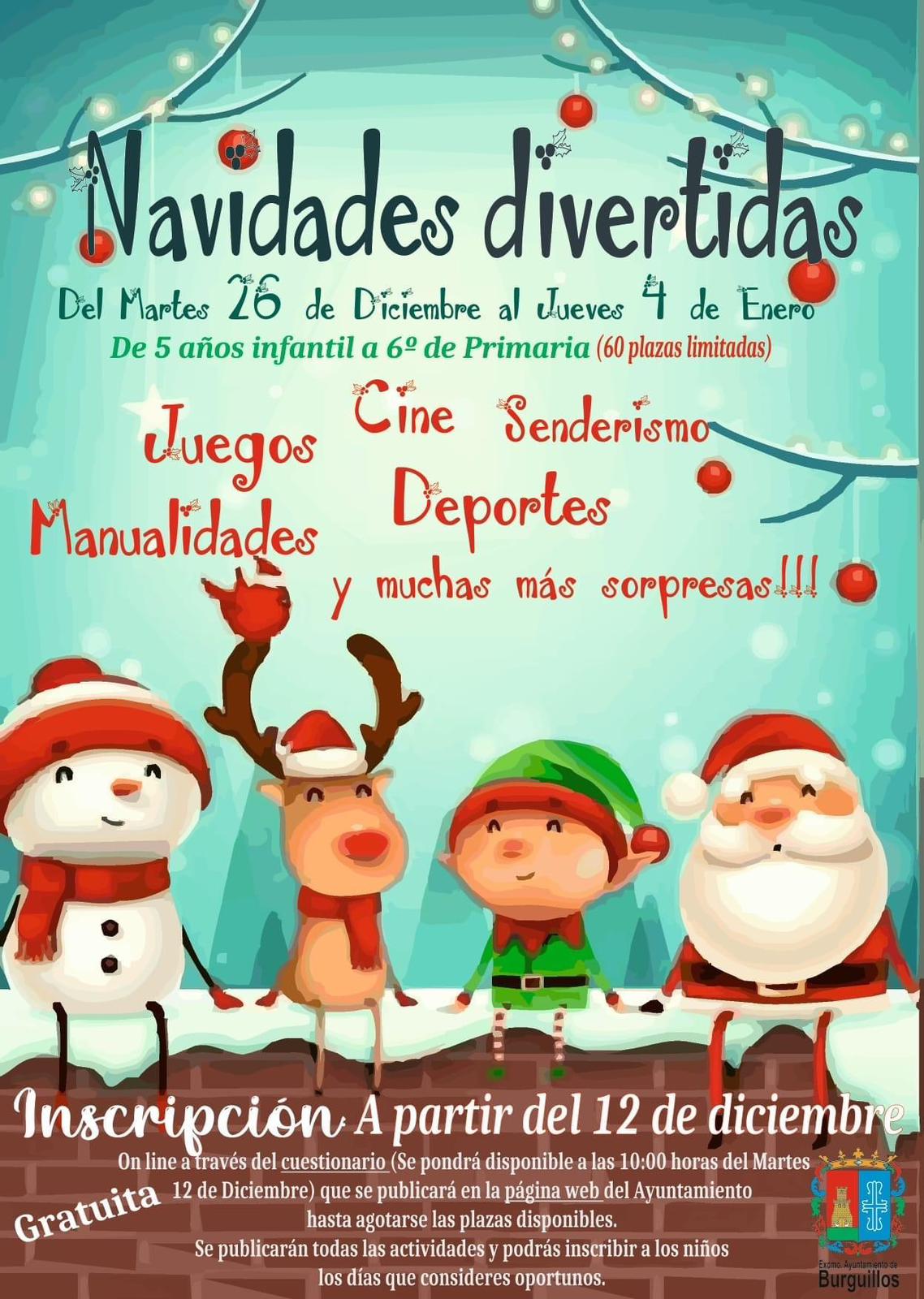 Llegan, un año más, las navidades divertidas a nuestro pueblo.Juegos, senderismo, manualidades, cine, deportes y muchas actividades más para los más pequeños. Toda aquella persona que quiera inscribir a sus hijos debe rellenar el cuestionario online que aparecerá en la página web del Ayuntamiento de Burguillos a partir de hoy. Plazas limitadas ¡Os esperamos¡