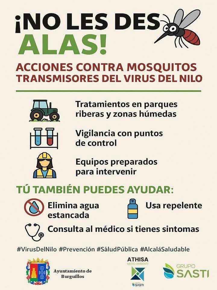 El Ayuntamiento de Burguillos ha puesto en marcha un Plan Municipal de Vigilancia y Control Vectorial tras la comunicación de la Consejería de Salud y Consumo, que sitúa a nuestro municipio en un nivel de riesgo medio respecto a la presencia del Virus del Nilo Occidental (VNO), siendo el riesgo de afectación humana bajo-moderado.