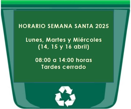 HORARIO DE SEMANA SANTA 2025 Lunes, Martes y Miércoles (14,15,16 abril) 08:00 a 14:00 h. Tardes cerrado Se trata de un cambio puntual