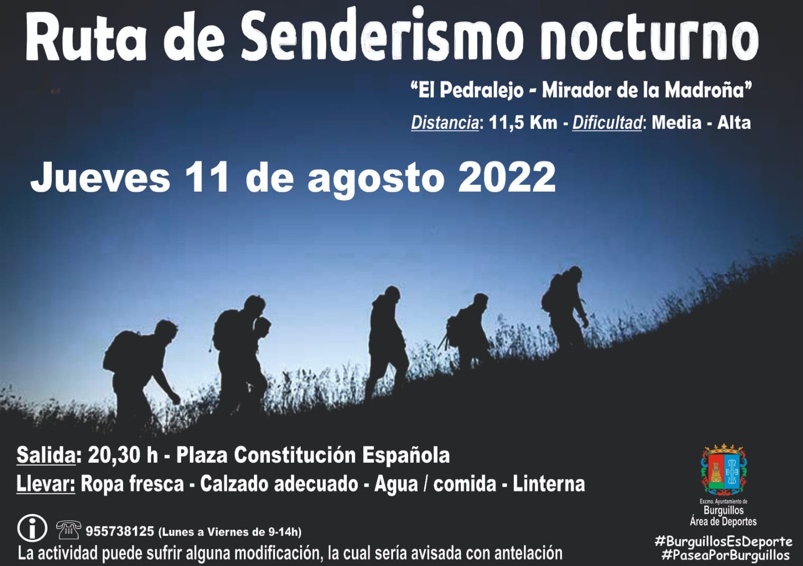 Volvemos con nuestras rutas de senderismo nocturno. En esta ocasión nos vamos al Pedralejo y al Mirador de La Madroña. Próximo jueves, día 11 de agosto, a las 20:30 en la Plaza de la Constitución Española.