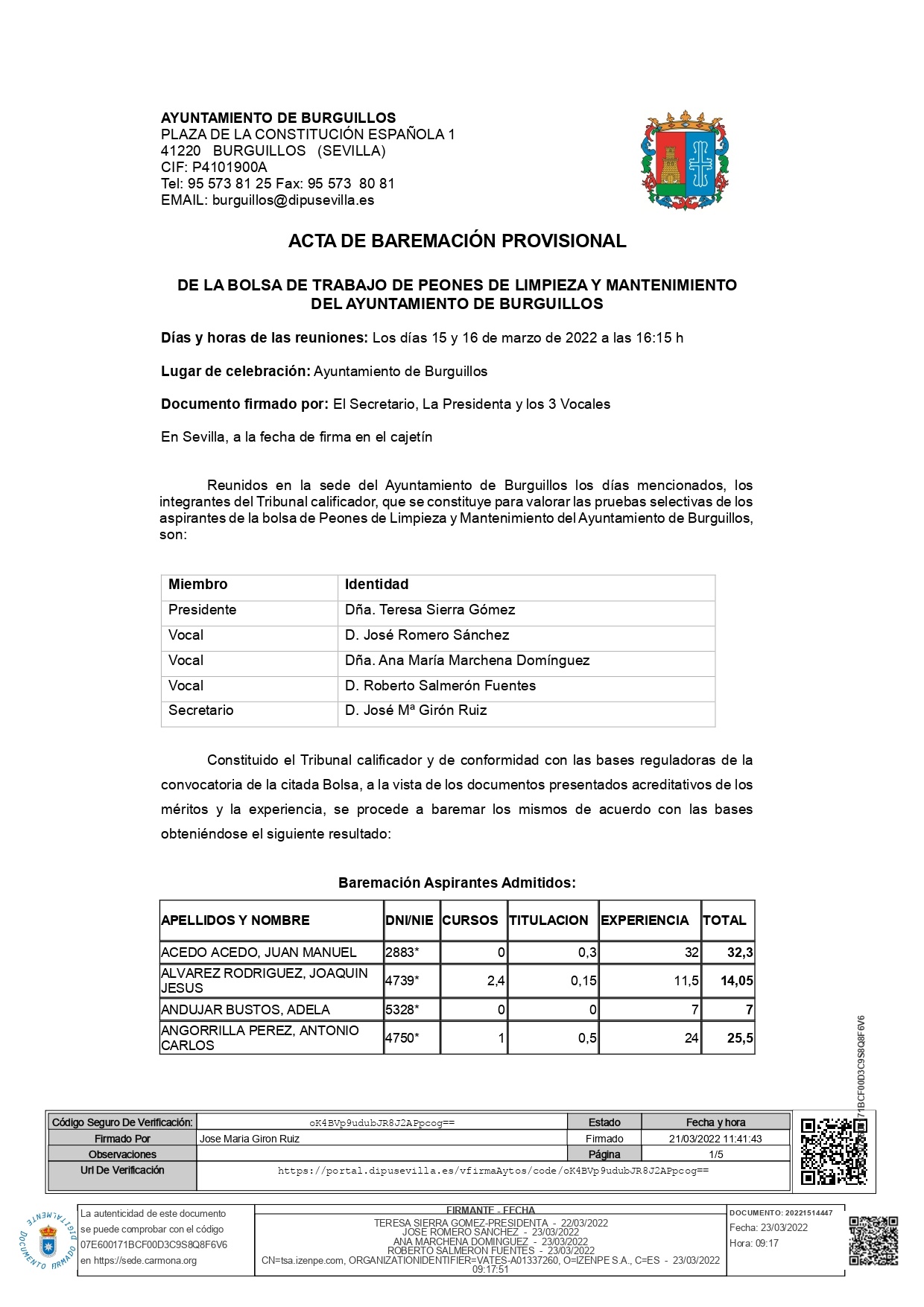 ACTA DE BAREMACIÓN PROVISIONAL DE LA BOLSA DE TRABAJO DE PEONES DE LIMPIEZA Y MANTENIMIENTO DEL AYUNTAMIENTO DE BURGUILLOS