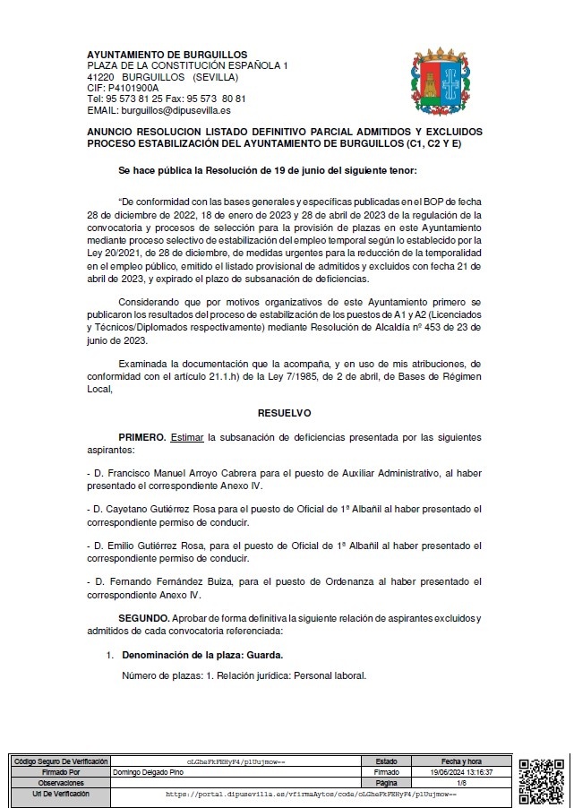 ANUNCIO RESOLUCION LISTADO DEFINITIVO PARCIAL ADMITIDOS Y EXCLUIDOS PROCESO ESTABILIZACIÓN DEL AYUNTAMIENTO DE BURGUILLOS (C1, C2 Y E)