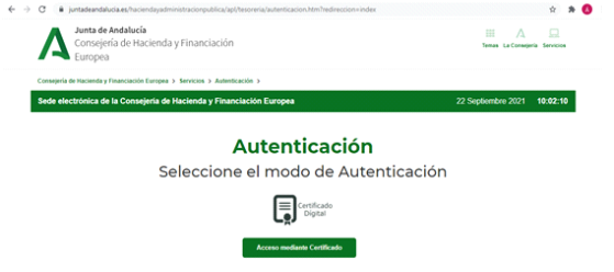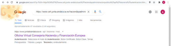 Deberá acceder a la Oficina Virtual de la Consejería de Hacienda y Administración Pública introduciendo en la tabla de buscador la siguiente dirección: https://www.ceh.junta-andalucia.es/haciendayadministracionpublica/apl/tesoreria/autenticacion.htm?redireccion=index