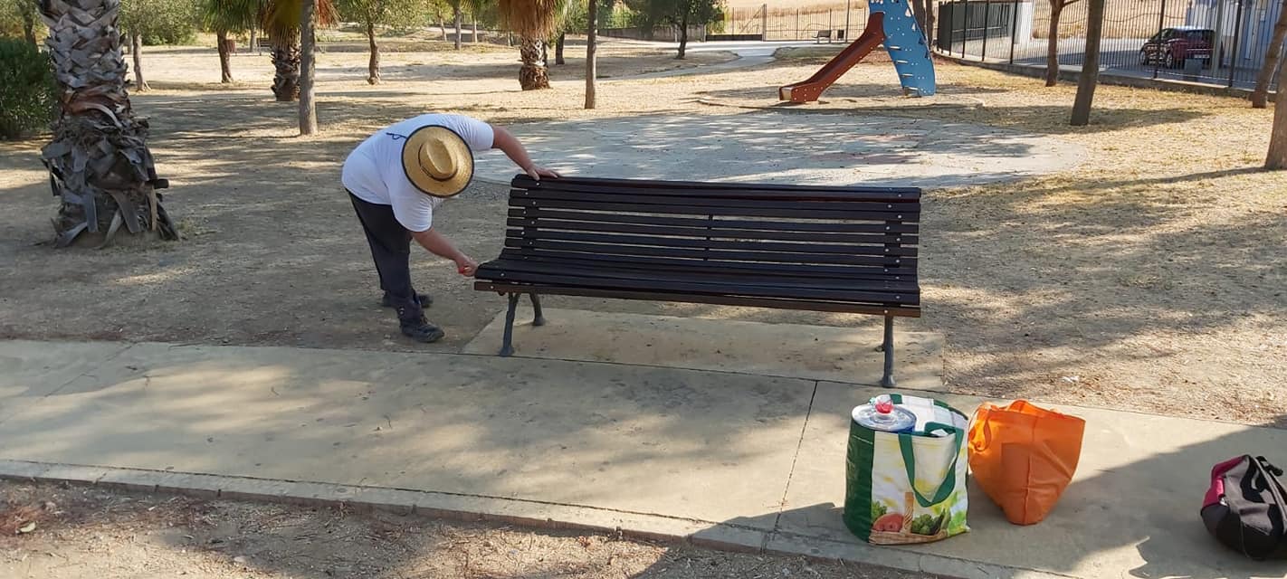 Galería de imágenes de los trabajos de adecentamiento en diferentes zonas de Burguillos: poda de palmeras, arreglo de los bancos del Parque del Barrio Lejos y pintura de la parte trasera de la fachada del Ayuntamiento.